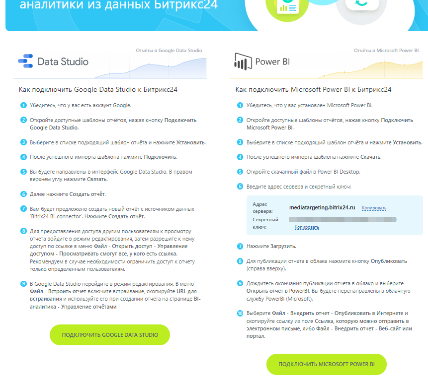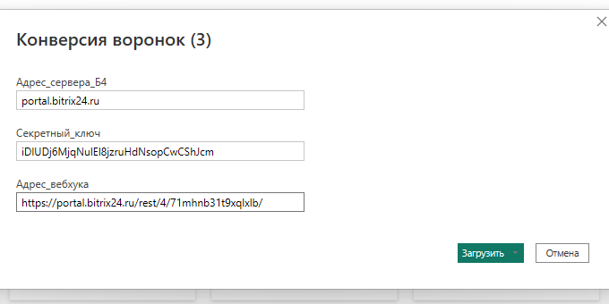 В качестве параметров подключаемого шаблона "Адрес_сервера_Б4" и "Секретный_ключ" используйте соответствующие значения полей "Адрес сервера" и "Секретный ключ" блока Power BI